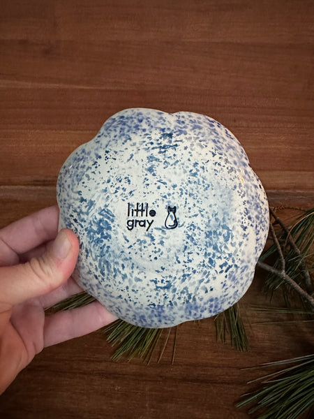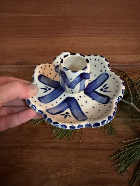 Wheel thrown and hand-built tapered candle holder. Painted in a Fantasier cobalt blue underglaze pattern and finished with a clear glaze.