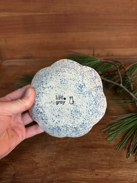 Wheel thrown and hand-built tapered candle holder. Painted in a Fantasier cobalt blue underglaze pattern and finished with a clear glaze.