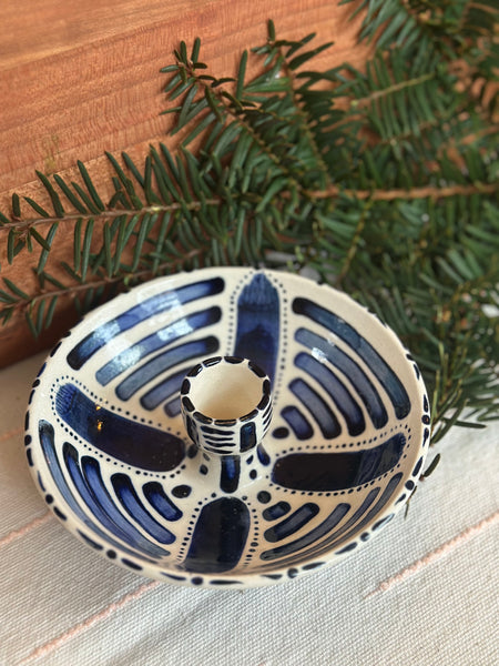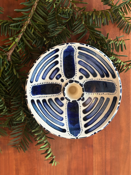 Ceramic blomma tapered candleholder in a porcelain/stoneware mix. Glazed in glossy clear with cobalt blue pattern. This candleholder is a bit wider and deeper with a fluted tulip shaped neck.