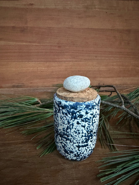 Ceramic jar with cork top and beach stone. Heavy dapple cobalt blue underglaze pattern, left raw unglazed on the outside, white glossy glaze inside. Volume is about 2 oz. Could be used as a container, or vase. Works with strike-anywhere matches.